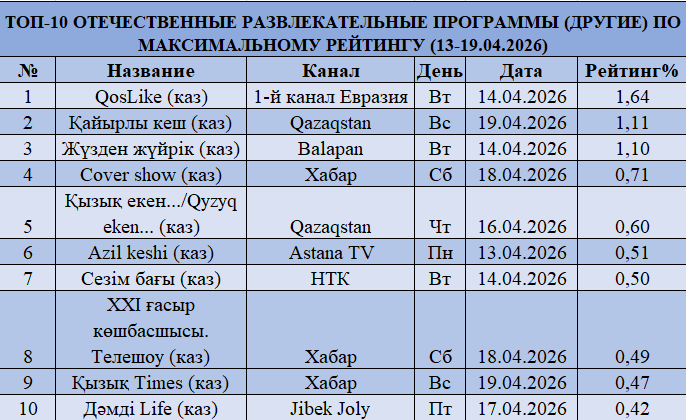 Ойын-сауық сегментінде «QosLike» (1,64%) айқын алға шығып, әлеуметтік-экономикалық бағдарламалар деңгейіне жақындаған жалғыз жобаға айналды. Қалған жобалар — «Қайырлы кеш» (Qazaqstan), «Жүзден жүйрік» (Balapan), «Cover show» (Хабар) — 0,7–1,1% аралығында екінші эшелонды құрайды.