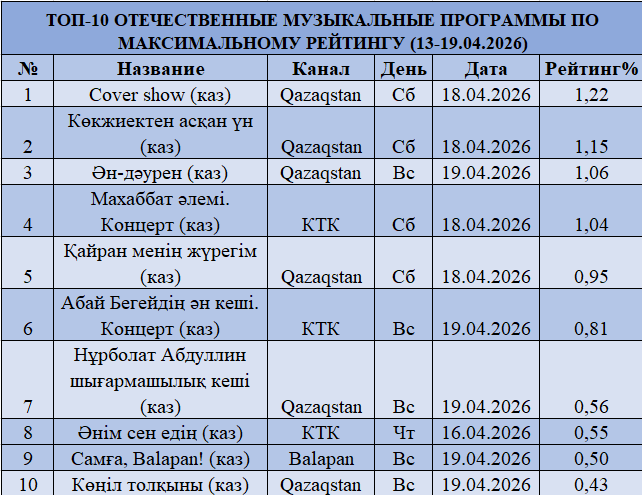 Музыкалық сегмент өткен аптамен салыстырғанда күтпеген өсім көрсетті. «Qazaqstan» арнасы «Cover show» (1,22%), «Көкжиектен асқан үн» (1,15%), «Ән-думан» (1,06%) жобаларымен мықты блок қалыптастырды. КТК концерттік форматтар арқылы (1,04% және 0,81%) өз позициясын күшейтті.