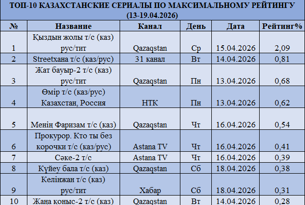 Телесериалдар аудитория шоғырланатын негізгі алаң болып қала береді. «Qazaqstanдағы» «Қыздың жолы» 2,09% көрсеткішке жетіп, аптадағы барлық жанрлар арасындағы ең жоғары нәтиже көрсетті. Бұл ретте «Streetxana» (0,81%) мен «Жат бауыр-2» (0,68%) жобаларынан айырмашылығы бірнеше есеге жетеді.