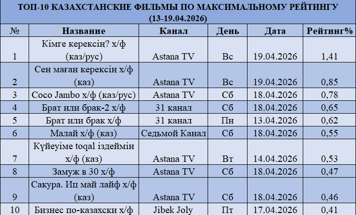 Киносегментте «Astana TV» негізгі ойыншы ретінде айқын көрінді. Топтағы жобалардың басым бөлігі осы арнаға тиесілі, оның ішінде көшбасшы — «Кімге керексің?» (1,41%). Бұл — сирек кездесетін құбылыс: контент бір жанр ішінде емес, бір арна аясында шоғырланған. Бұл арнаның нақты әрі дәл бағдарламалық стратегиясын көрсетеді.